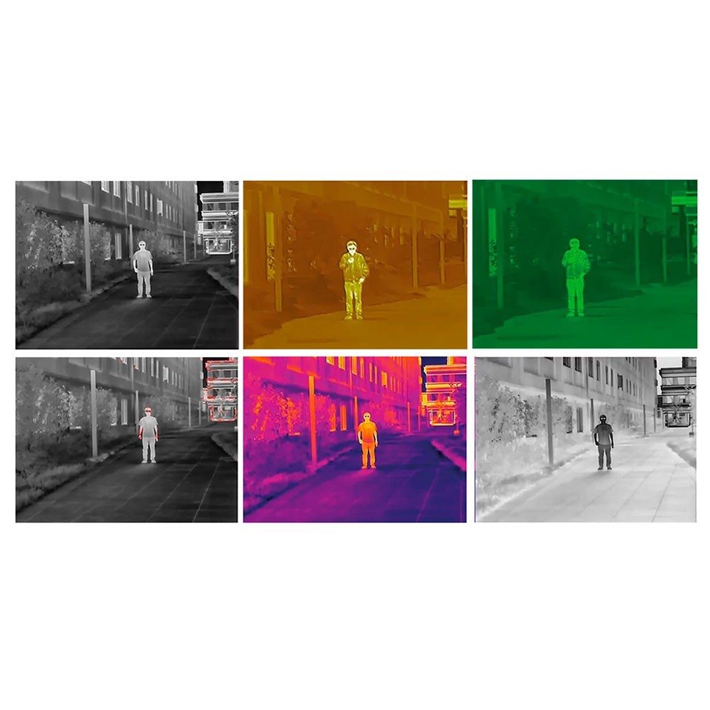 • 6 modos de visualización: red hot (imagen en blanco y negro con zonas cálidas resaltadas en rojo), white hot (imagen en blanco y negro con zonas cálidas resaltadas en blanco), Sepia, black hot (imagen en blanco y negro con zonas cálidas resaltadas en negro), green hot (imagen en blanco y verde con zonas cálidas resaltadas en verde), White hot (imagen en blanco y negro con zonas cálidas resaltadas en blanco)